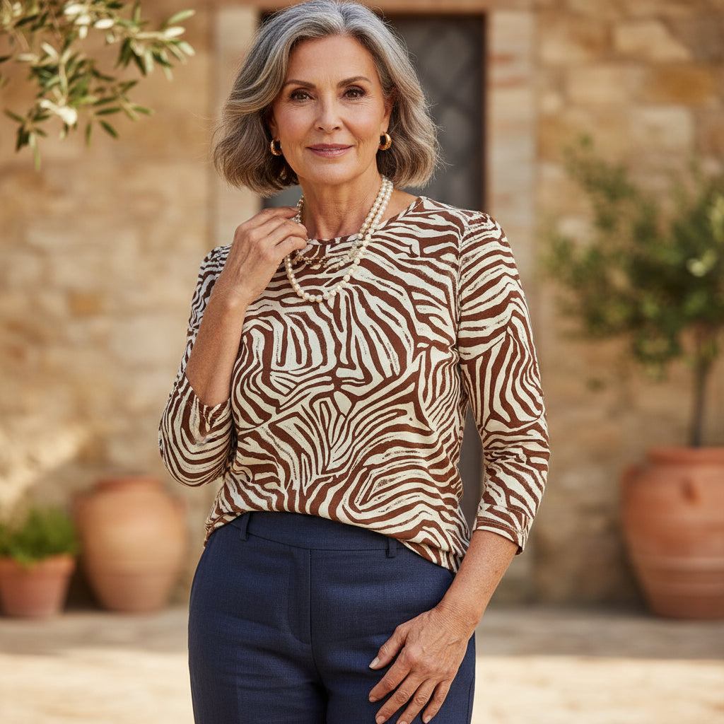 Scopri l’eleganza naturale di Allegram, la blusa a maniche lunghe con stampa zebra pensata per le donne che amano lo stile classico con un tocco contemporaneo. Il suo tessuto morbido e leggero offre il massimo comfort, mentre la stampa nei toni della terra esalta la raffinatezza e il calore di qualsiasi look. Perfetta da abbinare a pantaloni o gonne dal taglio dritto, Allegram è ideale sia per le occasioni casual che per gli eventi più eleganti. Il design aderente valorizza la figura senza rinunciare alla comodità, mentre le maniche lunghe aggiungono un tocco raffinato e versatile.